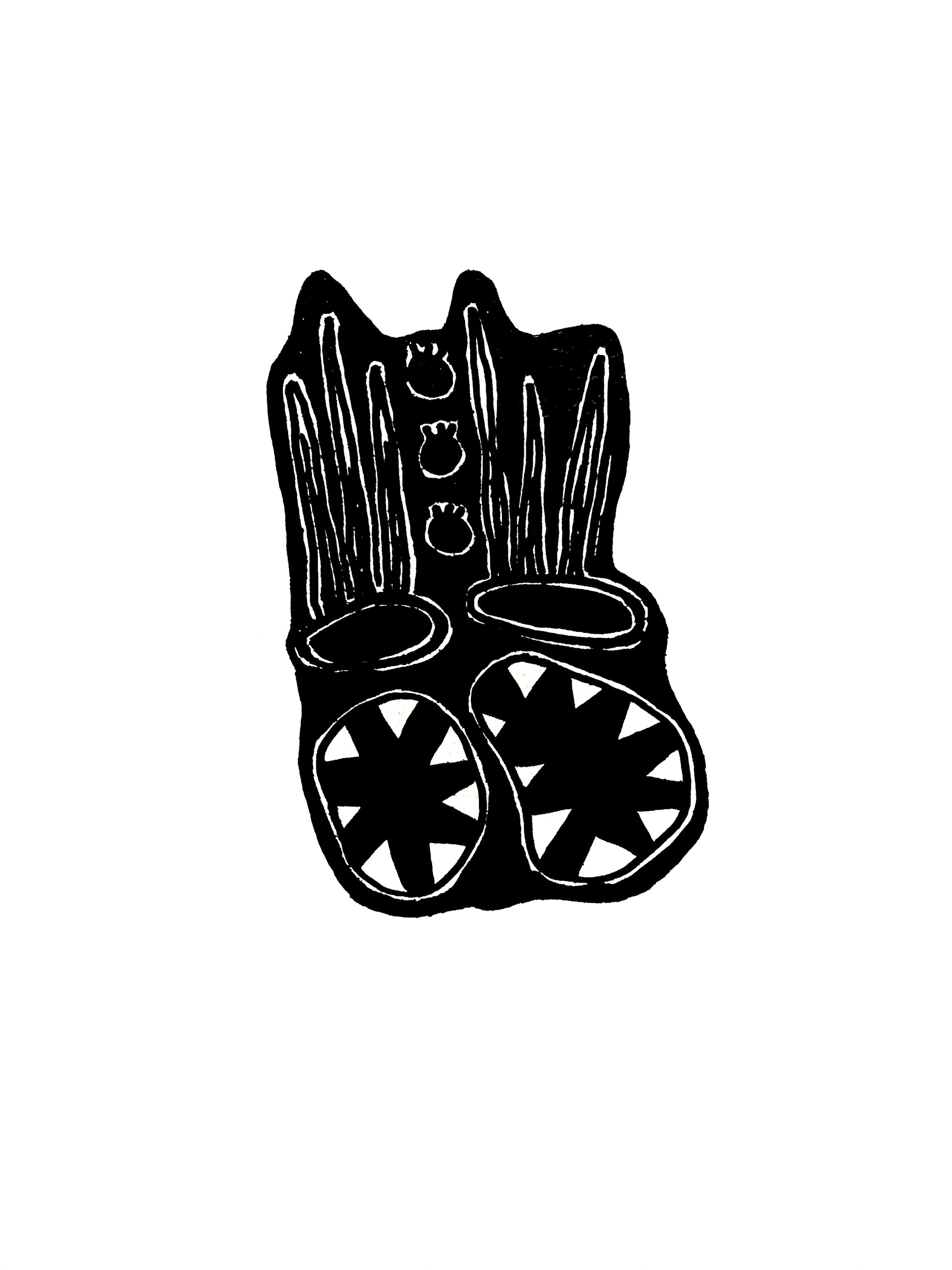 La pieza presenta la silueta frontal de un ser o animal deformado que evoca la esencia de un roedor, pero su forma es indistinguible y surrealista. Con dos bocas que muestran colmillos amenazantes, la figura despliega una inquietante dualidad, sugiriendo tanto peligro como curiosidad. La mirada loca y desafiante capta la atención, creando una conexión directa y perturbadora con el espectador.